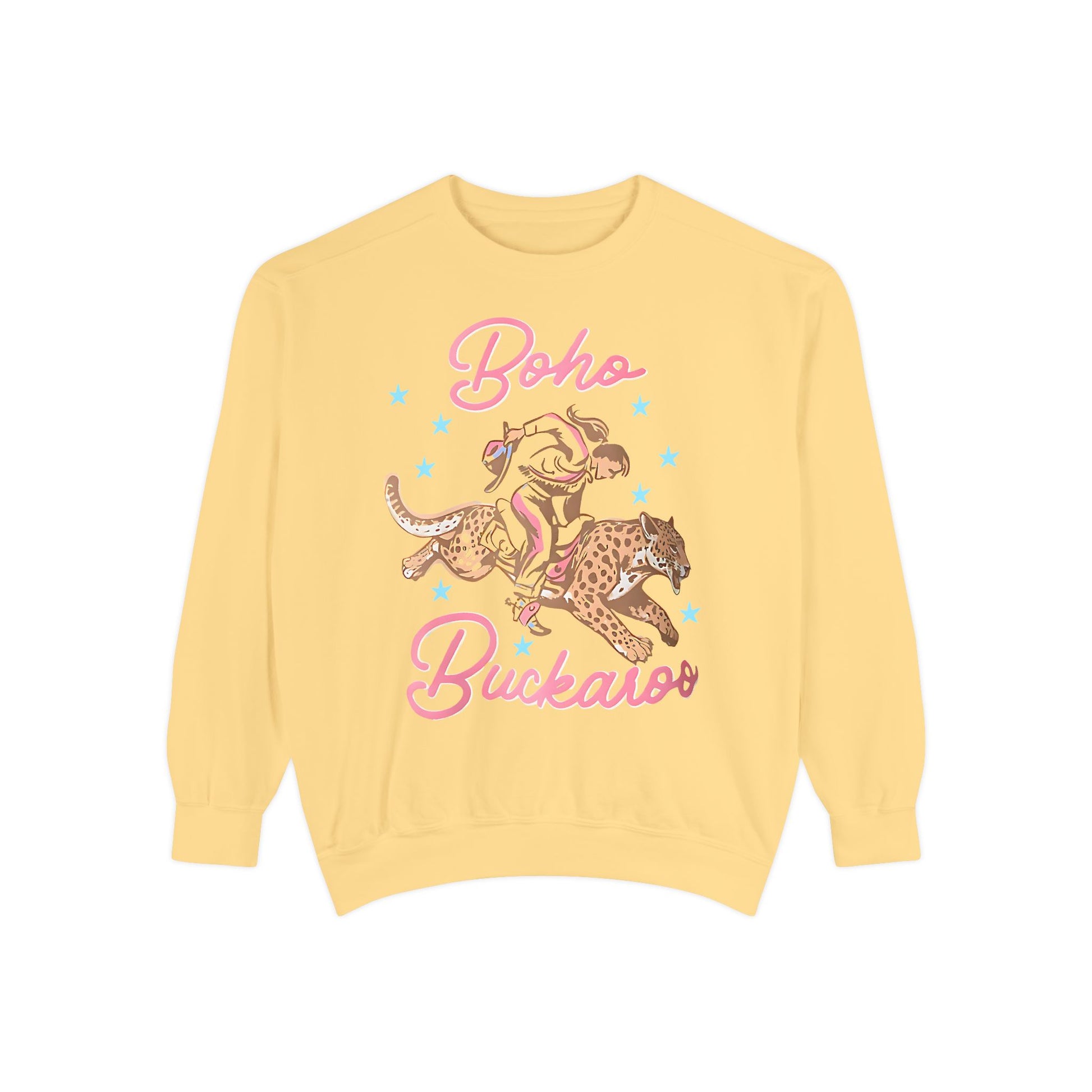 Channel your inner wild spirit with our Boho Buckaroo Comfort Colors® Sweatshirt 🤠✨. This bold graphic crewneck features a retro cowgirl riding a cheetah surrounded by playful blue stars and a trendy pink script font that says “Boho Buckaroo.”